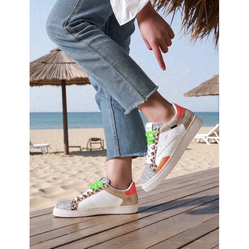 La basket Béryl Orange Findlay se distingue par un design audacieux et moderne. Sa base blanche est enrichie d’empiècements léopard sur les côtés, de paillettes argentées à l’avant et de détails orange qui apportent une touche lumineuse et dynamique.