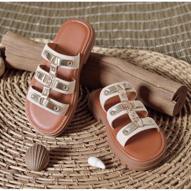 Elles se distinguent par trois larges brides avec détails dorés. La matière extérieure des lanières beige n’est pas lisse : elle a une finition effet tressé/toile, qui apporte du relief et un rendu plus naturel.